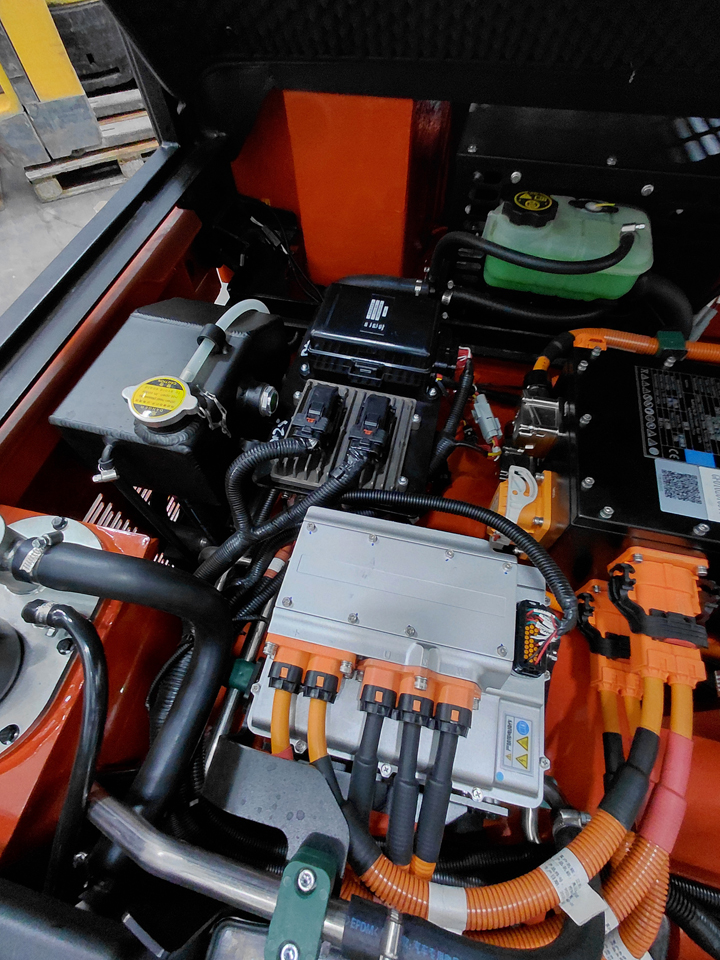 Een belangrijk technisch voordeel van de EFL553‑HV‑6 High-Voltage elektrische heftruck ligt in de toepassing van de PMSM (Permanent Magnet Synchronous Motor). Deze motor biedt niet alleen een hoger rendement dan traditionele AC‑motoren, maar levert ook meer koppel, een snellere respons en een stabieler vermogen tijdens intensieve taken. Het resultaat is een heftruck die krachtig accelereert, nauwkeurig manoeuvreert en efficiënt energie verbruikt. In vergelijking met conventionele AC‑systemen kan deze truck tot 15% energie besparen, wat resulteert in lagere operationele kosten en een langere inzetduur per laadcyclus.