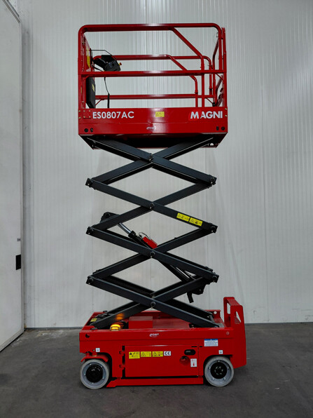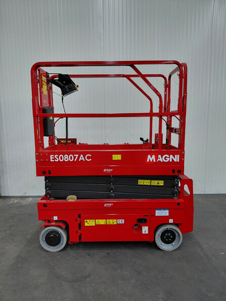 Magni Schaarhoogwerker ES0807E Maximale last platform: 230kg Maximale last platform verlenging: 113kg Max. aant. pers. (binnen/buiten): 2/1 Werkhoogte: 7,8 m Vloerhoogte: 5,8 m Lengte: 1,86 m Breedt: 0,76 m Hoogte (railing uitgeklapt): 2,18 m Hoogte (railing ingeklapt): 1,84 m Platform afmetingen: 1,67 m x 0,74 m Platform verlenging: 0,9 m Bodemvrijheid (ingeschoven): 0,09 m Bodemvrijheid (uitgeschoven): 0,019 m Wielbasis: 1,36 m Draaicirkel (binnen): 0 m Draaicirkel (buiten): 1,64 m Aandrijving: 24V/0,5kW Hef motoren: 24V/2kW Rijsnelheid (ingeschoven): 4,5 km/h Rijsnelheid (uitgeschoven): 0,8 km/h Op/Neer snelheid: 27/22 sec Accu's: 4x6V/210Ah Geïntegreerde oplader: 24V/25A Maximale hellingshoek: 25% Maximale scheefstand: 1,5°/3° Wielen: ø 305x100mm Voorwielen: / Gewicht (CE): 1415kg