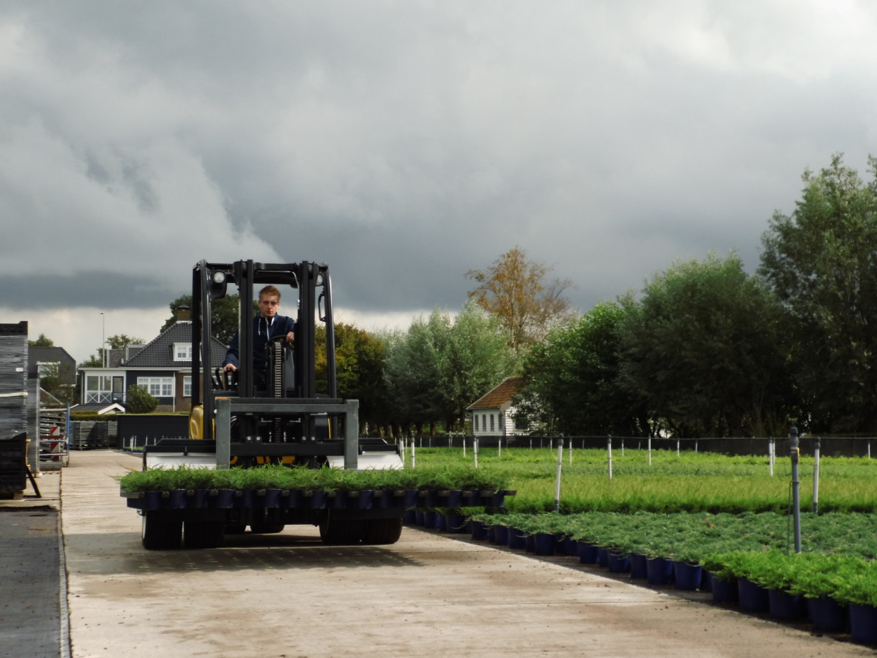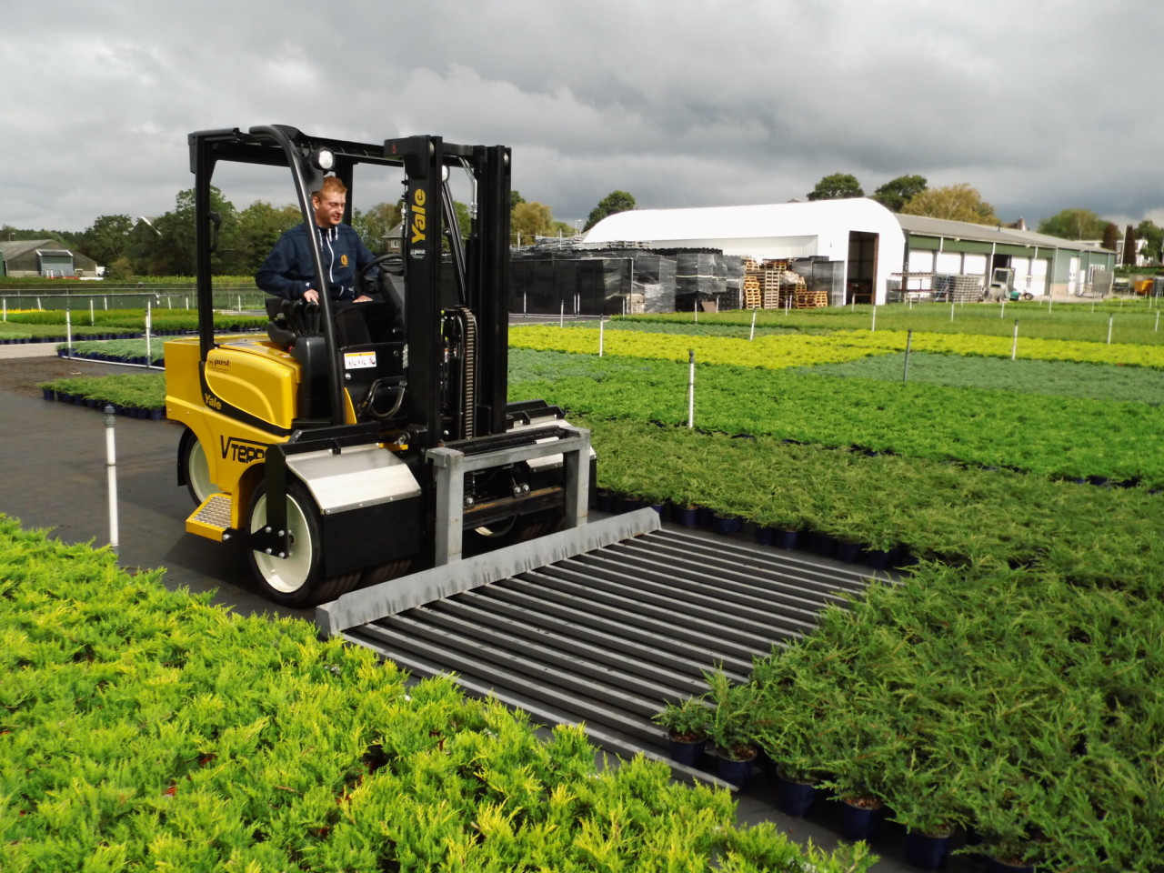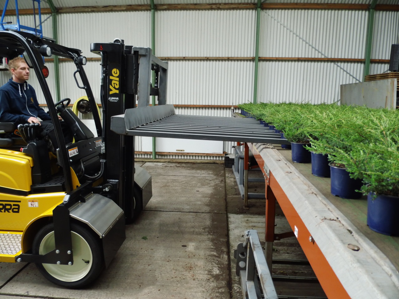 In de tuinbouw bleek behoefte aan een heftruck met een lage bodemdruk die bovendien geschikt is voor ruw terrein. Daarom heeft Heftruckcentrum Post in Emmeloord de Yale VTerra ontwikkeld. De basis is een elektrische heftruck van Yale. Door de dubbele volrubber banden wordt de bodemdruk lager en gelijkmatiger, en rijd jij comfortabeler over ruw terrein. Dankzij de dubbele driewiel‑uitvoering is hij bovendien zeer wendbaar. Daarnaast is deze heftruck snel en zuinig. Na je werkzaamheden laad je de machine eenvoudig op door deze aan te sluiten op het elektriciteitsnetwerk. Omdat deze truck een elektrische ruwterrein heftruck is, stoot hij geen uitlaatgassen uit en werkt hij geruisloos.